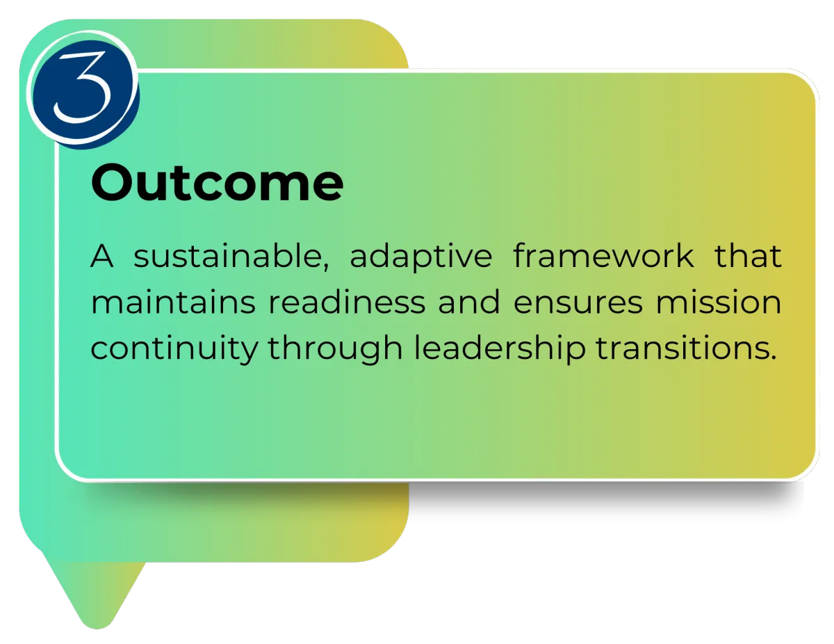 At Gamechangers Consulting, we understand that military and government organizations face a unique challenge: translating strategic intent into sustained operational results. Our methodology bridges that gap by embedding discipline, accountability, and performance systems that endure beyond leadership rotations.
